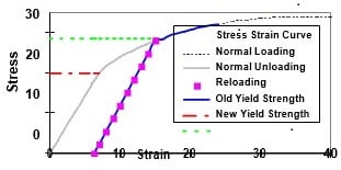Figure 1 below shows what theoretically happens during strain hardening. A certain amount of strain (deformation) is put into the material (gray line). When the load is removed, the material returns to a state of zero stress along a path perpendicular to the elastic loading line (purple squares). When the material is reloaded, it follows the same path up to the original stress-strain curve (blue line). However, the material’s elastic limit has been increased by a certain amount. The new yield strength (green dotted line) is now substantially higher than the old yield strength (dashed red line). Additionally, the total elongation has now diminished. This increase in strength will therefore diminish ductility and formability.