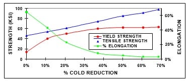 The degree of cold reduction determines the strength of a metal. As the percent cold work increases, so does the strength. Conversely, the total elongation decreases as cold work increases. Figure 3 shows the relationship between strength, elongation and cold work for yellow brass. If the percent cold work increases past a certain point, there are diminishing returns on strength. This is because at higher reductions, there are fewer free dislocations to become entangled. Also, the elongation (ductility, formability) decreases rapidly with cold work. Since the material is less able to plastically deform, fracture becomes much more likely.