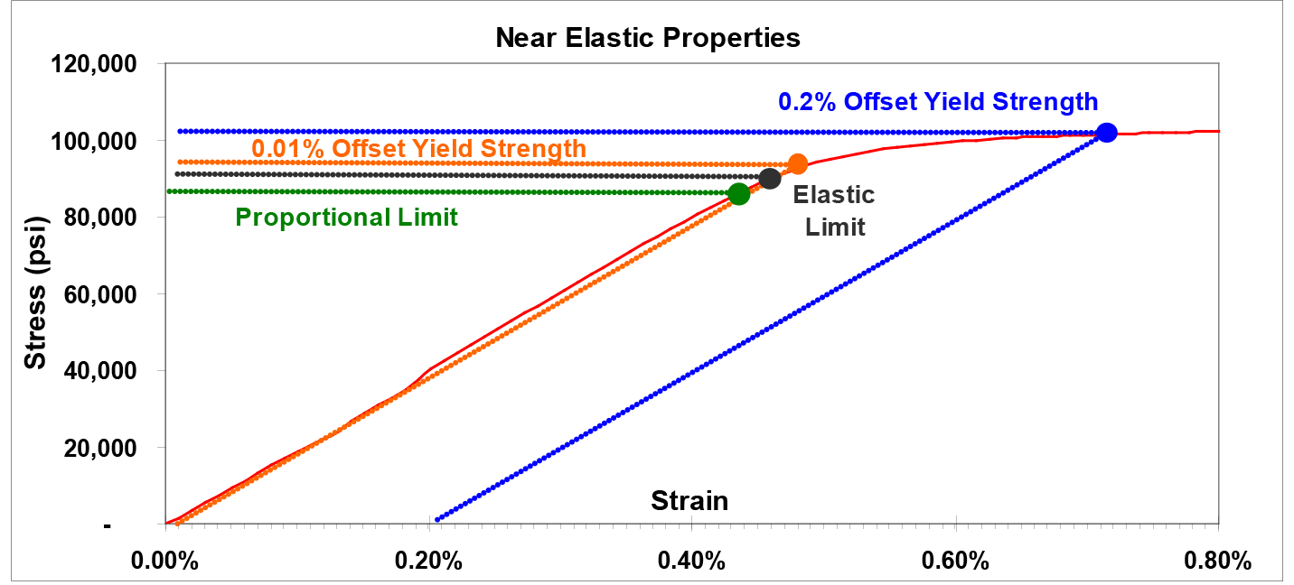 The stress and strain displayed in the first portion of a material’s stress-strain curve are linearly proportional to each other. This relationship forms a straight line on the stress-strain diagram, with a slope known as the elastic modulus of the material. The stress level at which the stress-strain response first begins to deviate from linear behavior is known as the proportional limit, shown below as the green line in Figure 1. The proportional limit is the maximum stress at which the material will continue to show elastic deformation.