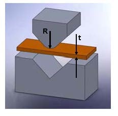 The formability of a copper alloy strip material is usually measured by the R/t ratio (sometimes called the MBR/t ratio). This specifies the minimum recommended inside radius of curvature (R) that is necessary to form a 90˚ bend in a strip of thickness (t) without failure. Materials with good formability will have small R/t ratios, whereas less formable materials will have higher R/t ratios. If the R/t ratio is equal to zero, then the material will, theoretically, survive a sharp (zero radius) bend. For a 90˚ bend, this means that the two legs of the punch will meet at perfect right angles.