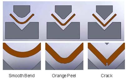 Figure 2 illustrates several possible outcomes of the bend test. With a generous punch radius, strip should bend smoothly on both the inside and outside radii. As the punch radius is reduced, the outside radius begins to show what is called “orange peel.” This is a rumpled texturing of the surface that looks similar to the texture of an orange. Orange peel is not necessarily indicative of cracking. For very inadequate bend radii, the sample will display obvious cracking, and may even break in half during the bend test. If cracking is uncertain, it is helpful to reverse the bend by hand - if cracks occurred in the test bend, the reverse bend will cause the sample to fracture.