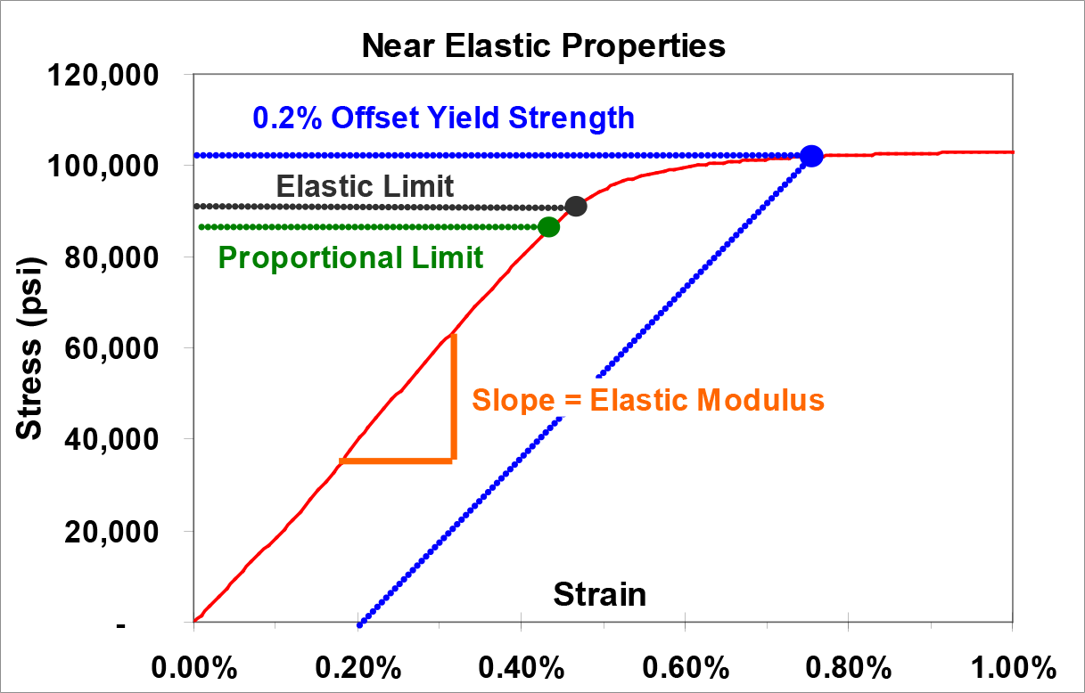 The yield strength is determined by finding the stress corresponding to a specified amount of permanent set, usually 0.2% strain for strip (or 0.5% extension under load for low-strength rod and wire). The 0.2% offset yield strength is found by drawing a line parallel to the elastic modulus from the 0.2% mark on the strain axis through its intercept with the stress-strain curve. (This is demonstrated by the dotted blue line in Figure 1 above.) Together, the yield strength, elastic limit and proportional limit are known as the near-elastic properties.